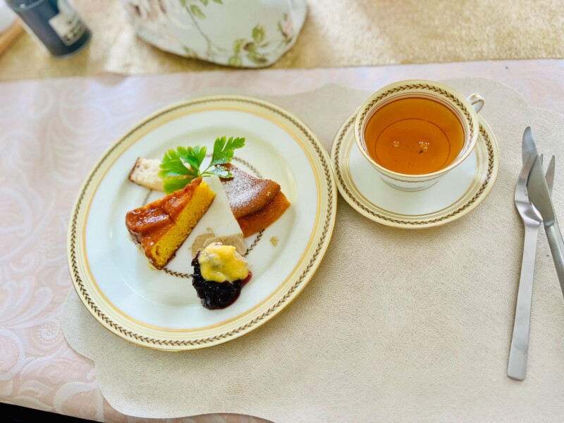 私が見本で作ったスフレケーキをプレートにデコレーションして、紅茶と一緒にお召し上がりあり頂きます。