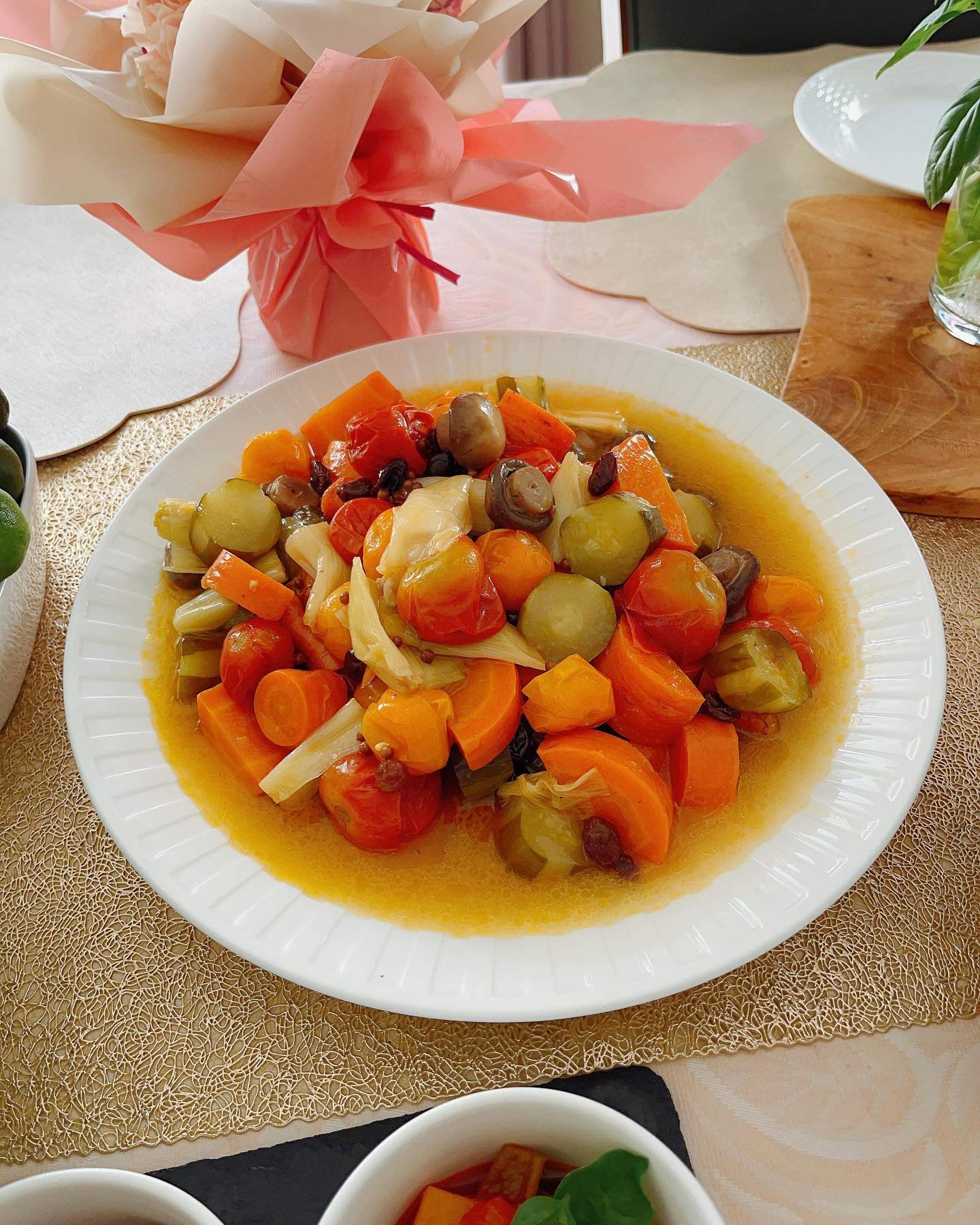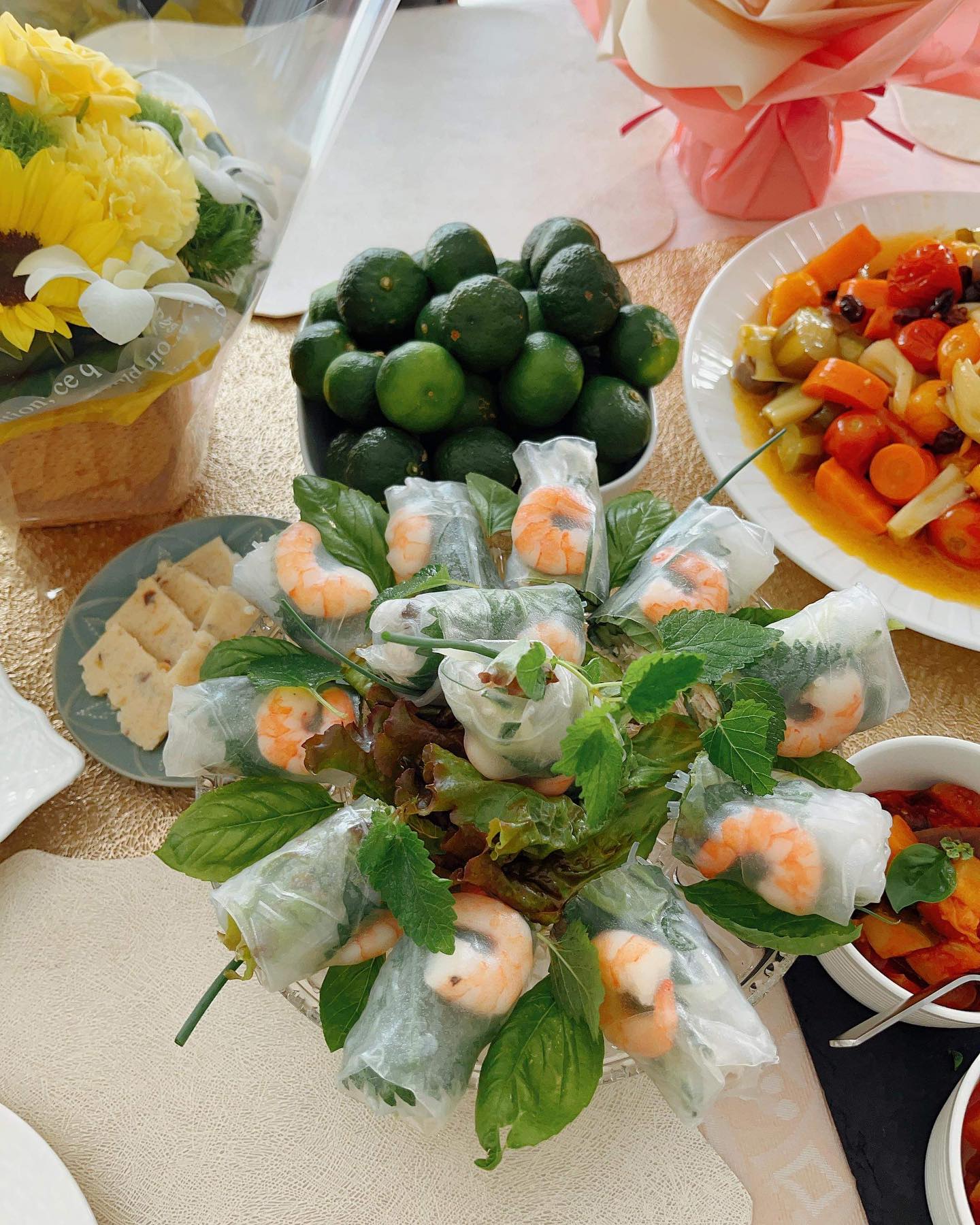 綺麗なお花や、果物、夏の旅行のお土産、発酵食のあれこれ、テーブルに乗り切らないほどの数々。