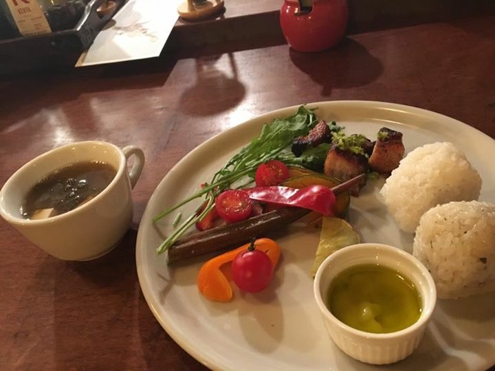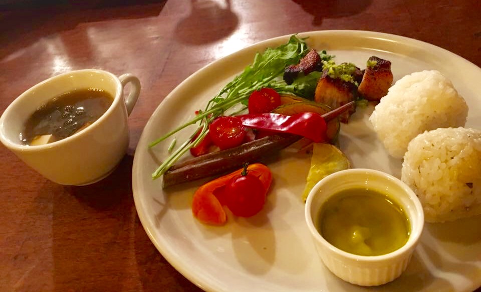 イタリアンおむすび2種類、ソイスープ=もずくのみそ汁、塩麹のバーニャカウダーと故郷群馬の自然栽培の野菜たち、自家製チャーシュー、